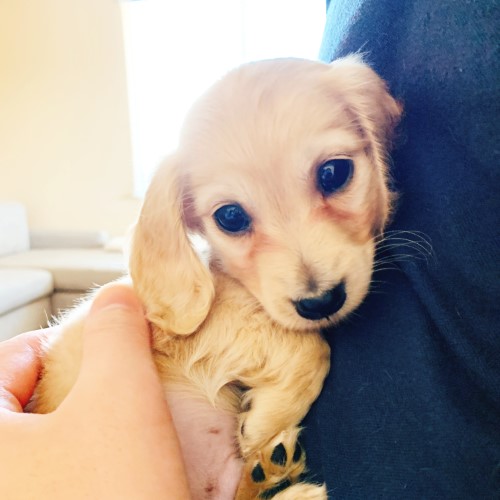 Meet my little boy, Bowie! He's a pale cream mini dachshund who takes lots of naps by my feet while I code. :)